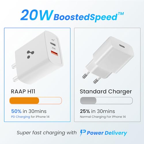 The Ambrane RAAP H11 wall charger harnesses a blazing charging speed of 20W, ensuring lightning-fast power delivery to your devices, so you can get back to full battery life in no time.
