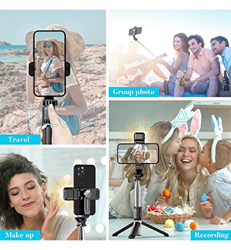 Rechargeable Fill Light with 6 Brightness Level ABS + Stainless Steel Material Anti-slip Handle Design Bluetooth Remote Control up to 32ft (10M) Combine Selfie Stick and Tripod Mode Multiple Compatibility with All Smartphone This Newest Selfie Stick Tripod Length is (70cm)