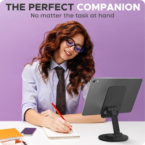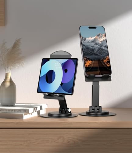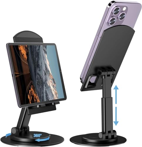 [High Flexibility and Adaptability]: The base can rotate 360 ​​degrees, and the height and angle of the bracket can be freely adjusted to meet your different usage needs [Note]: You can use a 4-sided screwdriver to tighten the screws in the two joints to help adjust the flexibility of the folding part as well as increase stability when placing phones with large screen sizes.