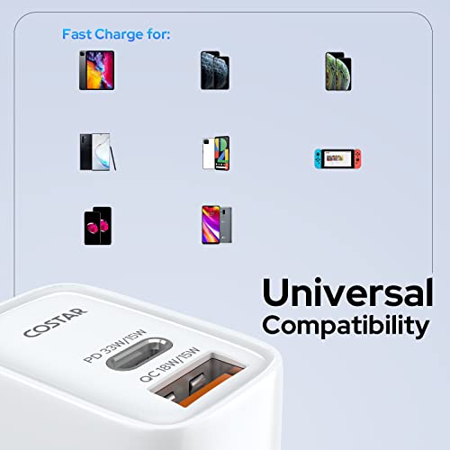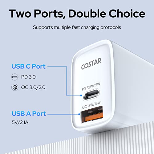✔【Dual Charging Ports】With its dual ports – an 18W Quick Charge port and a 33W Power Delivery port – COSTAR dual port charger adaptor allows you to charge two devices simultaneously.