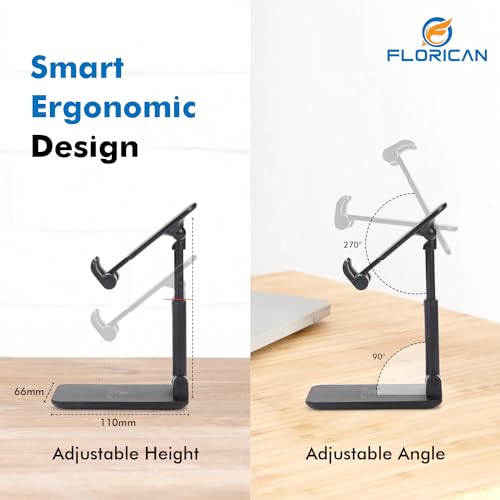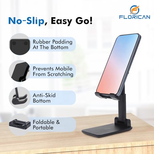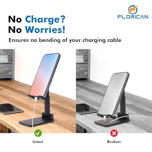 FREE YOUR HANDS – All 4-6.”5 Smartphones can be placed on the Florican desktop Phone stand firmly, compatible with all brands smartphones. So, you can liberate your hands to enjoy Facetime / video calling with family or friend, to take a record in video conference, to snack while watching Youtube video etc. ANGLE & HEIGHT ADJUSTABLE – The desktop phone holder stand can be adjusted from 4.3” to 6.3”,easily extendable in height. Also,it allows you to customise the angle of your device flexibly to find the most comfortable viewing angle. Reduce the frequency of looking down at the phone screen to avoid hurting your back and neck. FULLY FOLDABLE TO POCKET SIZE – Take it anywhere, this cell phone stand for desk is collapsible that can be fully folded into a pocket size. Storage little place, easy to carry it in your pocket or bag in travel or business trip. Convenient use, You can free hands to enjoy a Youtube Video or Facetime Calling anywhere at anytime with. the folding mobile phone stand holder. ANTI-SLIP & STRONG STABILITY – The silicone covered pad and the rubber hook assure your phone firmly in place and protect them from sliding and scratching. The cell phone stand is composed of an ultra-sturdy metal counterweight base and high-quality aluminum poles, which is strong enough to hold your mobile phone. The rubber feet under the base makes it more stable when you tap the devices. USER-FRIENDLY DESIGN – A humanized charging port is reserved, the phone stand holder allows you play your device while charging, and the depth of groove fits exactly with the phone and does not block the screen. You can also freely watch next episode or chat with friends while charging.