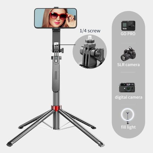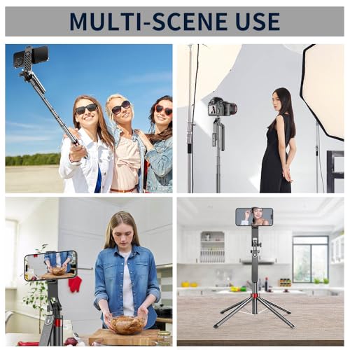 【360°Rotating Balance Grip】The selfie stick supports 360° panoramic shooting and 180° up and down shooting, allowing you to capture the perfect panoramic shooting effect. You can also mount an action camera or ring light, making it not only a tripod for your cell phone, but also an action camera/ring light stand.