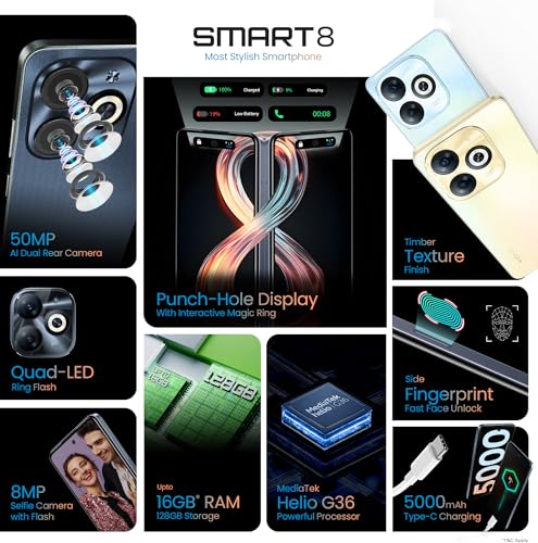 The Infinix Smart 8 – where innovation meets affordability, creating a smartphone experience that transcends expectations. Unleash the power of technology with a device that not only caters to your every need but also exceeds your visual and functional desires, delivering a device that doesn’t compromise on quality or features. Elevate your smartphone experience with the Infinix Smart 8 – where every detail is crafted to perfection, and every feature is designed to exceed your expectations. Product Description 50 MP Dual Camera with Quad-LED Ring Flash Capture the world in vivid detail with the 50 MP Dual AI Camera featuring a Quad-LED Ring Flash. This advanced camera system doesn’t just take pictures; it tells a story. The smart AI Camera recognises scenes and conditions, ensuring that each photo you click is a masterpiece. Whether it’s a breathtaking landscape or a cherished moment, the Smart 8’s camera elevates your photography game to new heights. 90 Hz Punch-hole Display Immerse yourself in the brilliance of the 16.76 cm (6.6) HD+ Punch-Hole Display that brings content to life like never before. With a high refresh rate of 90 Hz, every swipe, scroll, and video becomes a seamless visual experience. Say goodbye to lag and hello to a display that sets new standards for budget smartphones. Magic Ring The Infinix Smart 8 introduces the Magic Ring, a game-changer in user convenience. From Face Unlock to Background Call, Charging Animation, Charge completion reminder, and Low Battery Reminder – the Magic Ring is your gateway to a smarter, more intuitive smartphone experience. It’s not just a phone; it’s a companion that understands your needs. Premium Design Who says budget means compromising on aesthetics? The Smart 8 defies expectations with its premium design featuring Timber Texture. It not only looks sophisticated but also feels stunning in your hands.