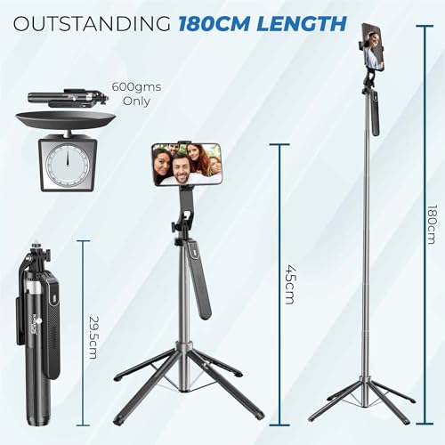 [Up to 62-inch Adjustable Length Tripod Selfie Stick] Unfolds to 62″ (158 cm) for broad views and high-angle shots. Folds to 13.2″ (33.6 cm)for easy carrying.Step-free adjustment lets you choose the perfect angle&height for indoor&outdoor photography