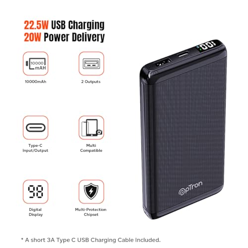 The pTron Dynamo Vortex 10000mAh power bank is a portable powerhouse with USB and PD/Type-C outputs, ensuring high-speed charging for your devices during your busiest and longest days. The 10000mAh large capacity enhances durability and optimizes charging efficiency, delivering a constant power supply to each connected device. Encased in a robust hard ABS shell, this power bank incorporates multiple protective functions, including Overcharge Protection, Over-Discharge Protection, Over Current Protection, Over Voltage Protection, and Short Circuit Protection, ensuring extended service life. The built-in digital display shows the battery % available in the power bank for easy recharge reminders. The power bank adopts a premium Li-polymer battery cell and achieves a full charge in approximately 4-5 hours. It caters to a diverse range of electronic needs and is compatible with smartphones, tablets, digital cameras, and handheld gaming devices. Additional specifications include Input Type-C: 5V/3A, 9V/2A | Output Type-C: 5V/3A, 9V/2.22A, 12V/1.65A | USB Output: 5V/3A, 9V/2.22A, 12V/1.65A, 10V/2.25A. Backed by a 1-year manufacturer warranty covering manufacturing defects only, customer support can be reached at 040-67138888 or via email at support@ptron.in.