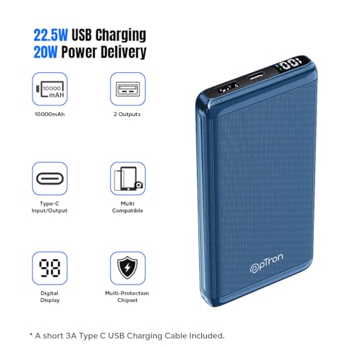 The pTron Dynamo Vortex 10000mAh power bank is a portable powerhouse with USB and PD/Type-C outputs, ensuring high-speed charging for your devices during your busiest and longest days. The 10000mAh large capacity enhances durability and optimizes charging efficiency, delivering a constant power supply to each connected device. Encased in a robust hard ABS shell, this power bank incorporates multiple protective functions, including Overcharge Protection, Over-Discharge Protection, Over Current Protection, Over Voltage Protection, and Short Circuit Protection, ensuring extended service life. The built-in digital display shows the battery % available in the power bank for easy recharge reminders. The power bank adopts a premium Li-polymer battery cell and achieves a full charge in approximately 4-5 hours. It caters to a diverse range of electronic needs and is compatible with smartphones, tablets, digital cameras, and handheld gaming devices. Additional specifications include Input Type-C: 5V/3A, 9V/2A | Output Type-C: 5V/3A, 9V/2.22A, 12V/1.65A | USB Output: 5V/3A, 9V/2.22A, 12V/1.65A, 10V/2.25A. Backed by a 1-year manufacturer warranty covering manufacturing defects only, customer support can be reached at 040-67138888 or via email at support@ptron.in.