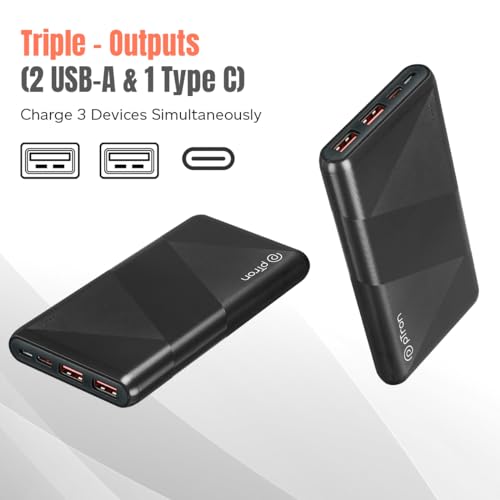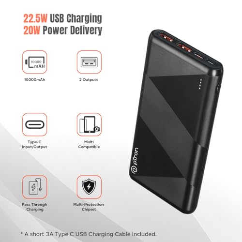 pTron Dynamo Z 10000mAh power bank is a portable powerhouse with a dual USB & PD/Type-C output that offers high-speed charging and ensures your devices make it through your busiest and longest days. Dual USB input (micro USB & Type-C/PD) and output – 2 USB ports, which can charge the devices at the same time, the USB-C and Micro USB provide two charging ways & convenient and fast. 10000mAh large capacity is more durable and optimizes charging efficiency, offering constant power to each connected device. A durable hard ABS case and multiple protective functions ensure long service – Overcharge Protection/Over-Discharge Protection/Over Current Protection/Over Voltage Protection/Short Circuit Protection. This portable power bank adopts a premium Li-polymer battery cell and gets charged in about 4-5 hours. It’s compatible with smartphones and tablets as well as a variety of digital cameras and handheld gaming devices. Other specifications: Input (Type-C & Micro USB) 18W: 5V/3A, 9V/2A, 12V/1.5A | Output (USB-1 & USB-2) 22.5W: 5V/4.5A, 4.5V/5A, 5V/3A, 9V/2A, 12V/1.5A | Output Type-C 20W: 5V/3A, 9V/2.22A, 12V/1.67A. 1-year manufacturer warranty from the date of purchase on manufacturing defects only, customer care contact details: 040 – 67138888 or email us at support@ptron.in