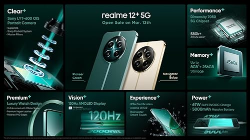 ☆【Design】:- Trendy Watch Design, Immerse yourself in sophistication with the trendy watch design of the realme 12 5G. The Polished Sunburst Dial, featuring over 500 interwoven sunbursts, creates a stunning play of light. Complemented by the 3D Jubilee Bracelet and Polished PVD Edges, this smartphone is a fashion statement, merging style with substance