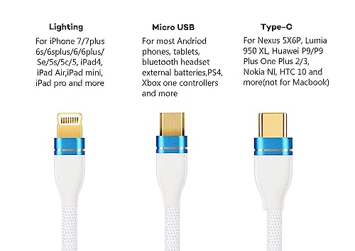 【Super Quality Materials】 This 3 way charger cable is made of nylon braided with aluminum connector, which provides premium durable flexibility and prevents from breaking or damage, that means this multi cable can ensure you with a longer service life.