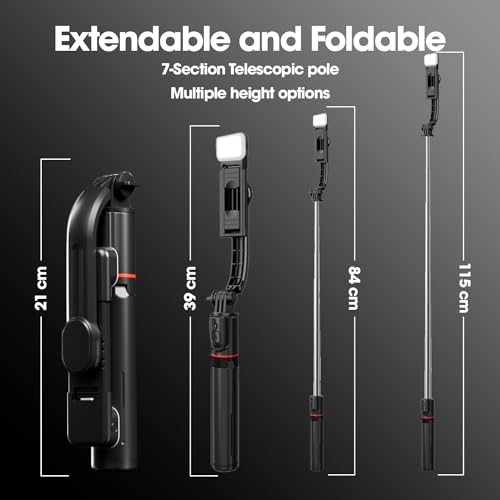 【Extendable and Foldable】: The selfie stick tripod is extendable up to 45 inches (113cm) with a 7-section telescopic pole, while its foldable length is 21cm, ensuring compactness and portability for easy carrying and storage. Additionally, it features a 1/4″ interface for compatibility with GoPro, camera, and ring light accessories.