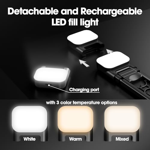 【Detachable Light】: Equipped with a detachable light featuring 6 shades, including 3 colors and 2 tones, allowing you to adjust the lighting according to your preference and environment for the perfect shot.