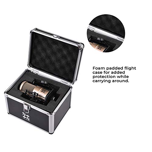 A solid die-cast body that is sturdily built to withstand damages, steel mesh with padding to protect the capacitor. A large diaphragm with 2 metal plate in close proximity to each other which is used to convert acoustics signals to electrical output. Features an integrated shock mount with the microphone.